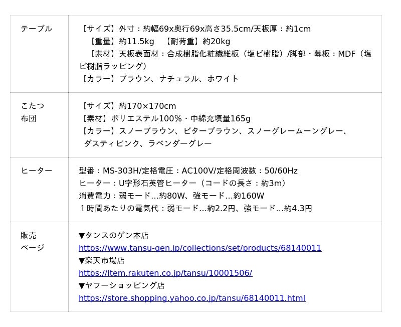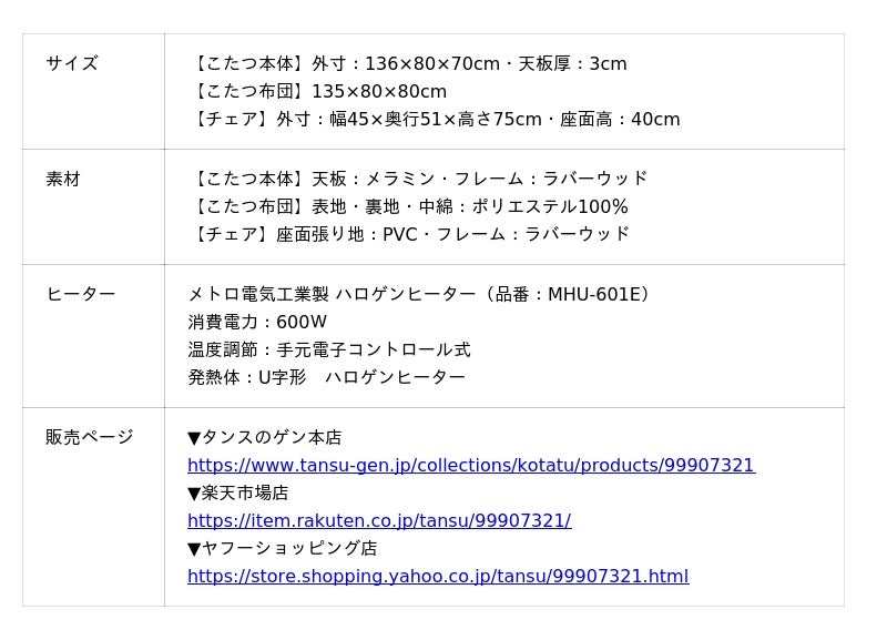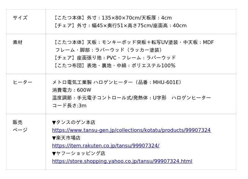本製品はテーブル・こたつ布団・チェアのセット販売になります。