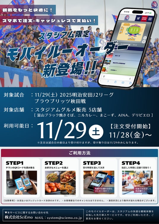 株式会社SciEmo(本社:東京都世田谷区、代表取締役:丸本瑞葉)は、2025年11月29日(土)に開催される「2025明治安田J2リーグ カターレ富山 vs ブラウブリッツ秋田」のホーム最終戦において、スタジアム飲食売店を対象としたモバイルオーダーシステム「すまぴく(smart pickup)」の実証実験を実施いたします。本取り組みは、来場者の利便性向上と売店の業務効率化を目的としており、対象店舗の商品を事前注文・決済し、当日スムーズに受け取れる体験を提供します。