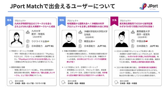 JPort Matchは、グローバル人材に特化した新卒採用就職情報サイト。JPort Matchの強みとして豊富な記事や動画コンテンツを用意しており、グローバル人材の母集団形成・採用広報を可能にします。日本の大学で学ぶ外国人留学生と企業人事を直接繋ぐグローバル採用広報サイトには、146カ国・10,000名以上が利用し、累計マッチング数2,700件(前年比305%増)が生まれています。