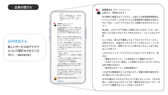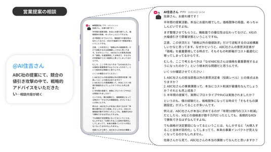 「AI住吉」を導入してみて気がついたのですが、想像していなかった使われ方が次々と発見できることです。当初はAI事業に直接関わるメンバー向けに構築しましたが、今では社内のAIビジネス企画公募の壁打ち相手として使われ、さらにはHR部門が採用候補者の見極めの際に「住吉ならこの候補者をどう評価するか」を問いかけるなど、組織全体に広がってきています。「AI住吉」が、メンバーが自ら考えを深めるためのパートナーになっている-この体験を通じて「組織の意思決定のスピードと質を高めるサポートをしてくれるAIになる」ことの可能性を確信しました。