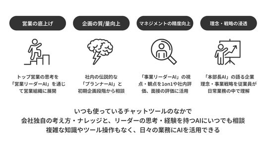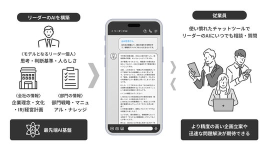 今回の合意に基づいて共同開発する「リーダーズAI」は、経営層に加えて、企業内の事業リーダー、営業・企画・販売・開発等の各部門において企業を牽引しているリーダーの思考をAI化し、“理想のリーダー”を創り、育て、活用を深めていくAIサービスです。