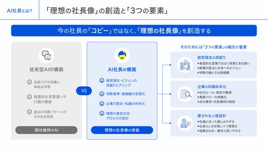 AI社長は、既存の類似サービスとは根本的に異なるアプローチを採用しています。過去の社長の言動を模倣するのではなく、企業が「どうありたいか」という理想像を明確に言語化し、それに基づいて判断や回答を行うAIを構築します。