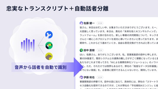 複数の参加者がいる会議においても、AIが音声データから自動で話者を分離します。これにより、「誰が何を話したか」を可視化し、議事録の正確性を高めることが可能です。音声から話者判定をしているため、一つの拠点から参加している場合でも、話者を判定して分類することが可能です。