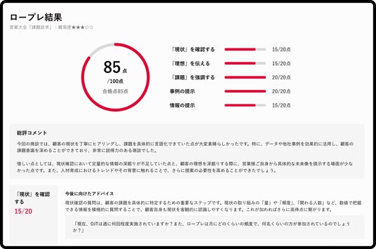 ロープレ後には、定量・定性の評価と共に具体的なアドバイスを提示。評価項目はナレッジワークが定義した標準営業スキルを活用することも可能。