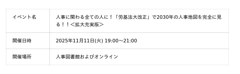 株式会社Trustyyle(本社:東京都中央区・代表取締役:吉田洋介)は、2025年11月11日に、同社が運営するコミュニティ「人事図書館」にて、「人事に関わる全ての人に!『労基法大改正』で2030年の人事地図を完全に見る!!<拡大充実版>」を開催しました。