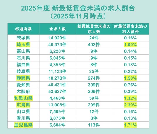 一方で、調査日が2025年11月3日であったことから、直近の11月1日に最低賃金が改定された埼玉県・静岡県・和歌山県・広島県・鹿児島県では、新最低賃金未満の求人割合がいずれも1%を超える結果となりました。一部の求人では、注釈として「10月以降は最低賃金以上に引き上げ予定」といった記載もありましたが、その他の求人では今後の内容の見直しが求められます。