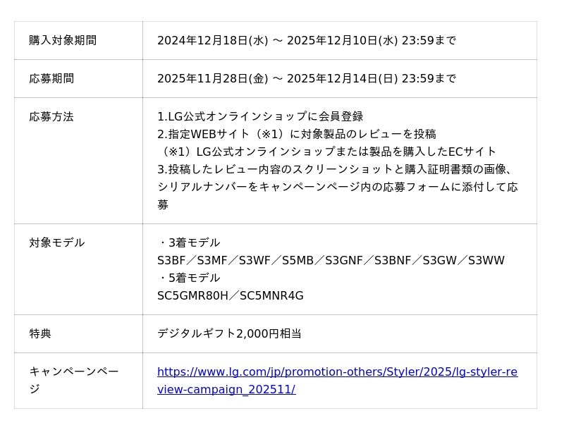 この機会にぜひ、大切な衣類を気軽にケアできる「LG Styler(TM)」をご購入・ご利用いただき、奮ってご応募ください。応募方法や対象モデルなどの詳細は、キャンペーンページ(https://www.lg.com/jp/promotion-others/Styler/2025/lg-styler-review-campaign_202511/)をご確認ください。