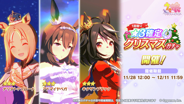 Cygamesは11月28日、ゲーム「ウマ娘 プリティーダービー」にて新衣装の★3育成ウマ娘「[祝祭遊戯]ナカヤマフェスタ」「[雪白の夢路]ドリームジャーニー」が登場するガチャを開催した。期間は12月11日まで。