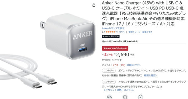 Amazonブラックフライデーセールで登場!Anker Nano Charger(45W)with USB-C&USB-C ケーブル