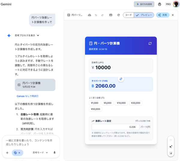 ただし筆者の環境では、すべての質問で自動的にUIが生成されるわけではなく、Canvasモード(コード編集画面)やガイド付き学習モードなど、用途に応じたモード選択が必要なケースも多い。「完全に自動でアプリが出てくる」というよりは、「適切なモードを選べば、より簡単にアプリが作れる」機能と捉えたほうが実態に近い。