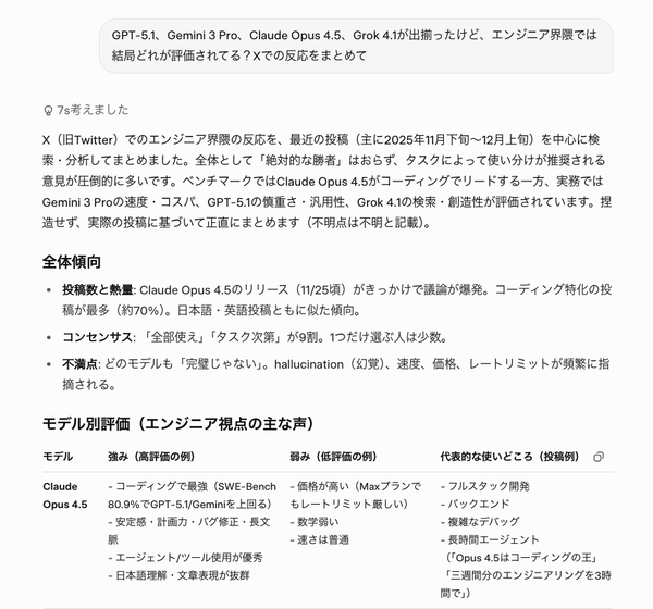 実際にGrok 4.1を使用し、本記事のテーマである「最新AIモデルの評価」について、X上のエンジニアたちの投稿を分析させた結果が以下だ。