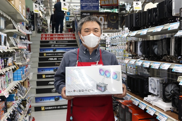 大阪・日本橋のPCパーツショップ「PCワンズ」を取材しました。店舗スタッフ・高石智基さんのオススメは、ASUSの水冷CPUクーラー「ROG RYUO IV SLC 360 ARGB White Edition」(以下、ROG RYUO IV SLC 360 ARGB WE)です。