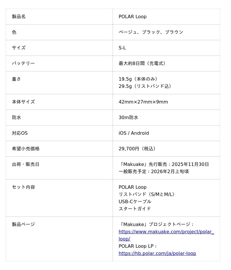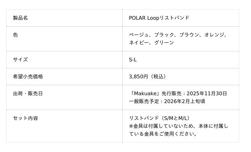POLAR Loopは11月30日(日)より、アタラシイものや体験の応援購入サービス「Makuake」で先行販売を開始いたします。またオンラインを含む全国のポラール製品正規取扱店での一般発売は、2026年2月上旬頃を予定しています。希望小売価格は29,700円(税込)、カラーは、ベージュ、ブラック、ブラウンの3色展開、S/MとM/Lの2サイズのリストバンドが同梱されています。また交換用のリストバンドも同時発売いたします。希望小売価格は3,850円(税込)、カラーはベージュ、ブラック、ブラウン、オレンジ、ネイビー、グリーンの6色展開です。リストバンドも同様の2サイズが同梱されています。