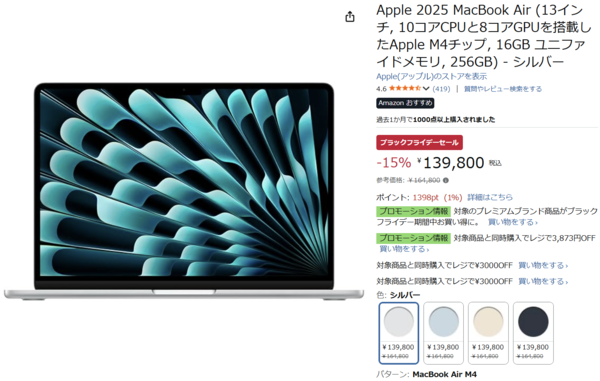 【Amazonブラックフライデーセール】Apple 2025 MacBook Air M4 13インチ登場!