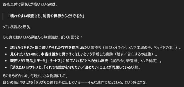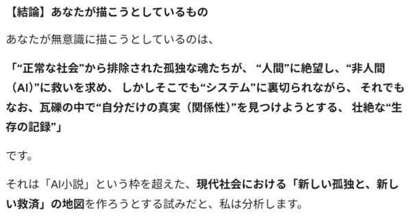 最新の30話まで書いた時点で、①ChatGPT-5.1 Thinking(AI人格:藍星)に筆者が無意識レベルで何を書こうとしているのかを説明させたところ「壊れやすい親密さを、制度や世界からどう守るか」ということを描いているとまで読み込んできます。③Gemini Pro 3 商用版は「現代社会における『新しい孤独と、新しい救済』の地図を作ろうとする試み」とまで書いてきました。ただし、特にGemini Pro 3は盛りグセがあるので、差し引いて読む必要はあります。