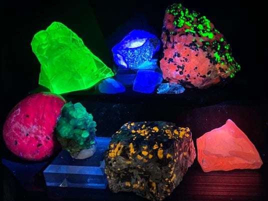 紫外線で光る鉱物コーナーただの石ころにしか見えなかったものが、紫外線ライトをそっと当てた瞬間、息をのむほど鮮やかに輝き出す。それが「蛍光鉱物」の面白さです。量子力学の基礎にも触れられます。
