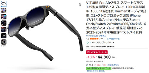 【40%オフ】VITURE Pro XR/AR Glasses 135インチ大画面がブラックフライデーセールで44,800円に!