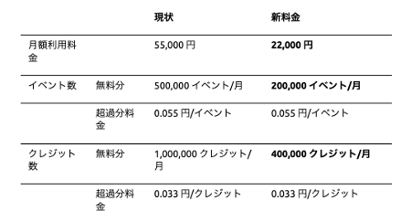 クレジット無料枠をサイズダウンし、月額基本料金を税込55,000円 から 税込22,000円 とサイズダウン致しました。「PoCから商用展開までシームレスに拡張できるように」という観点での変更となります。
