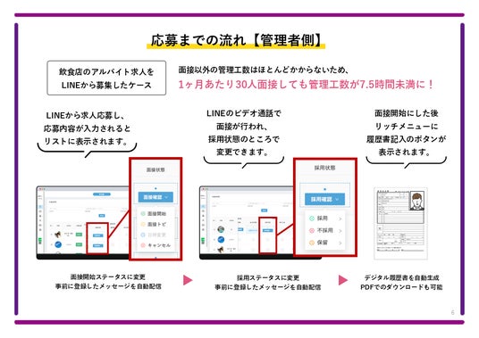 店舗管理者側の手間も徹底的に軽減。たとえば、月30名の面接を行う場合、従来は1人あたり30分程度かかっていた日程調整・履歴書チェックなどの作業が、ナイトリンクでは月合計7.5時間以下に削減可能です(※当社調べ)。