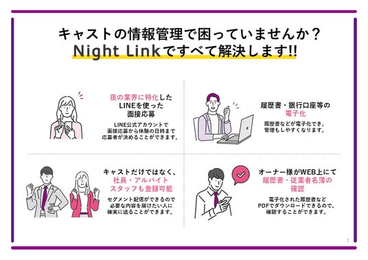 「ナイトリンク」は、キャバクラ・ガールズバー・ラウンジ・スナックなど水商売に携わる店舗が抱える“面接管理の手間”や“従業員情報の整備不足”といった課題を、LINEだけで解決する画期的なサービスです。