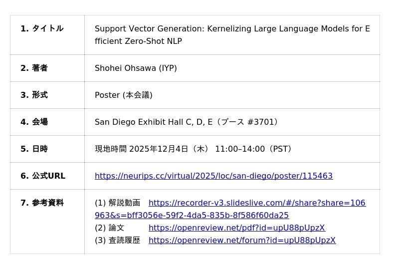Support Vector Generation(SVG)は、大規模言語モデル(LLM)をそのまま再学習するのではなく、「凍結した言語モデルをカーネルとして扱い、追加のパラメータ学習なしにゼロショット/少数ショット分類を実現する」ことを狙った新しい枠組みです。NeurIPS'25の公式プログラムでは、以下のとおりポスター発表が予定されています。