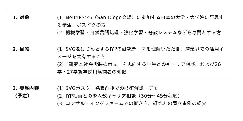 IYPは、2025年11月30日(日)~12月7日(日)に米国サンディエゴで開催されるNeurIPS 2025会期中、同カンファレンスに来場する日本人学生を対象に、SVGデモの解説とあわせたキャリア相談の場を提供し、2026年4月入社(26卒)および2027年4月入社(27卒)の新卒採用につなげてまいります。