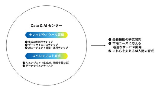 近年、生成AIや機械学習などのAI技術は飛躍的に進化し、従来の自動化ツールでは困難だった高度な判断や専門知識を要する業務領域においても、AIが人間に匹敵する遂行能力を発揮する時代となりました。こうした変化を背景に、DX戦略を深化させるため、AI技術を核として設置する「Data&AIセンター」の活動の柱は、以下の3点です。