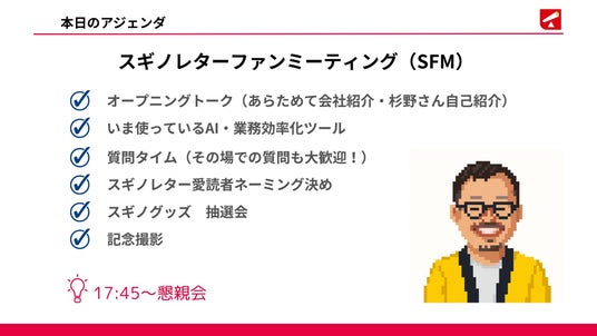 スギノレター購読者を対象に、オンライン・オフラインあわせて多数の読者が参加。杉野による“ガチのAI活用術”や業務効率化ツールの紹介、質問コーナー、スギノグッズ抽選会など、温かく盛り上がりに満ちたイベントとなりました。