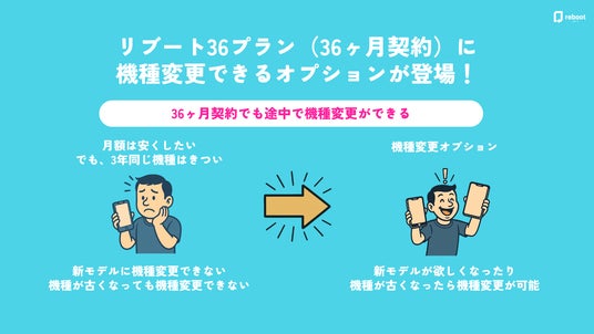 リブートは、従来の13ヶ月、18ヶ月、24ヶ月プランに加え、今回新たに提供を開始する「36ヶ月プラン」など、利用者の多様化するニーズに応じた選択肢を提供することで、より柔軟で快適なスマホ利用体験を提供してまいります。