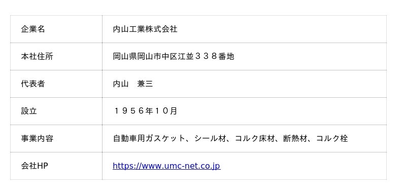 内山工業株式会社はコルク栓の製造から始まり、長年培った密封と絶縁技術を磨きながら、自動車用部品・食品用包材などの開発・製造・販売をおこなっています。