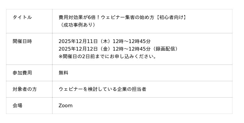 【12/11・12開催|無料ウェビナー】「費用対効果が6倍!ウェビナー集客の始め方【初心者向け】(成功事例あり)」開催のお知らせ