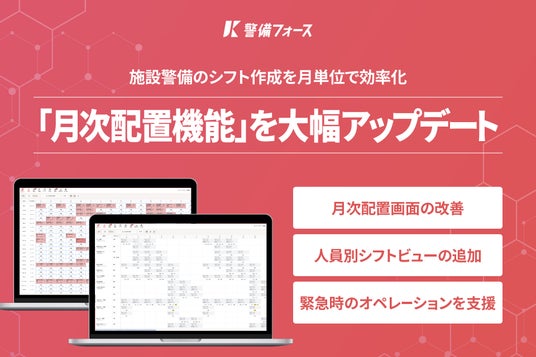 警備会社向けのオールインワンSaaS「警備フォース」を提供する株式会社メディカルフォース(本社:東京都品川区、代表取締役CEO:畠中 翔一、以下「メディカルフォース」)は、警備フォースにおいて1号警備(施設警備)向けの「月次配置機能」を大幅にアップデートいたしました。