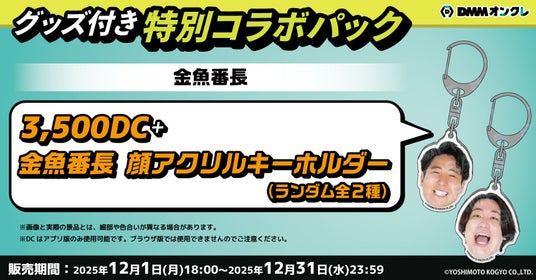 DMMオンクレのプレイに必要なDC(3,500DC)と、金魚番長のお二人の顔写真を使用したアクリルキーホルダーがセットになったコラボパックを販売します。