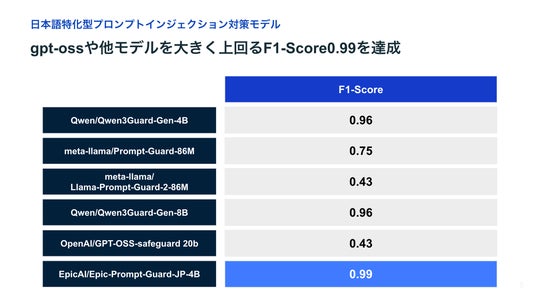 株式会社EpicAI、日本語特化のプロンプトインジェクション対策モデル「Epic-Guard-JP-4B」を開発:OpenAI/gpt-oss-safeguardらを上回るスコアを達成