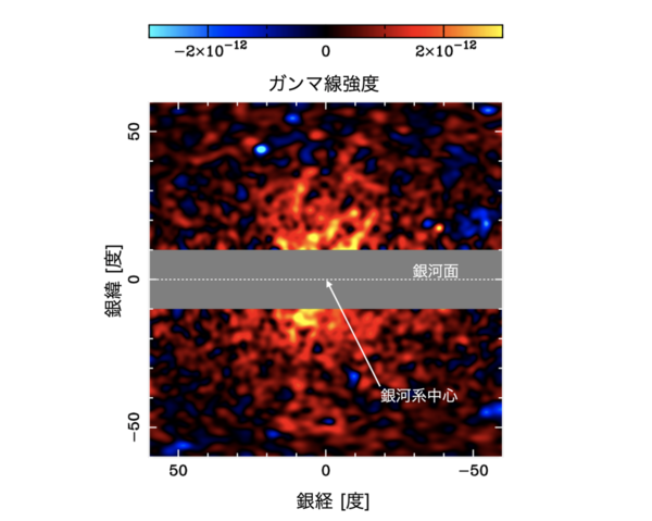 ハロー状に光るガンマ線放射の強度マップ。天の川銀河を中心とする銀河座標で表示。銀経は銀河面方向に測った経度、銀緯は銀河面から測った緯度。観測されたガンマ線強度マップから、ハロー以外の成分を除去したもの