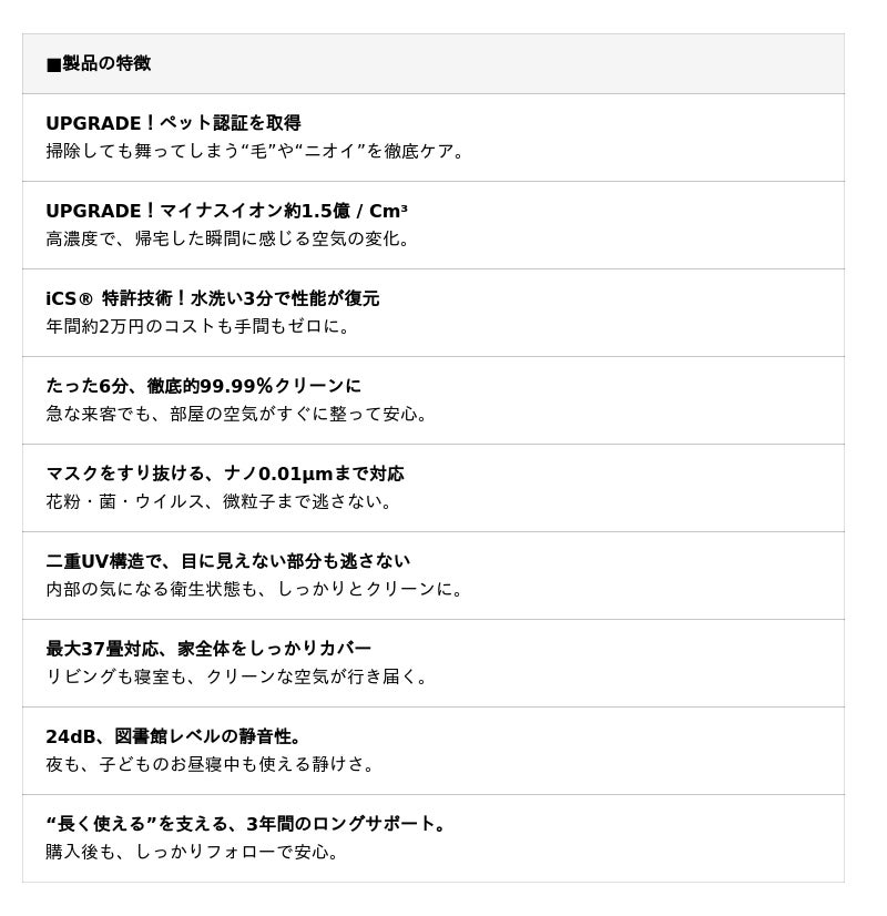 特許iCS(TM)技術の「洗浄再生型フィルター」採用により、フィルター交換が一切不要 。汚れてもわずか3分の水洗いで性能が新品級へ復活します 。