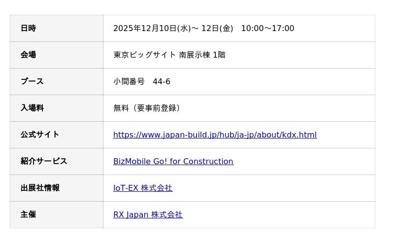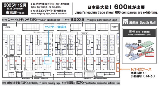 異なる会社のモノやサービスを安全に接続し、連携を可能にするIoT-EX株式会社(アイオーティー・イー・エックス、所在地:東京都千代田区、代表取締役社長:小畑至弘、以下:IoT-EX社)は、2025年12月10日(水)から12日(金)に東京ビッグサイトで開催される「JAPAN BUILD TOKYO」内 「第5回 建設DX展[東京]」に出展・登壇いたします。