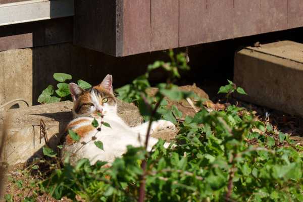 そこからぐぐっと望遠にして寝てる姿を。気持ちよさそうなので起こさないように気をつけつつ狙ってみた。きれいなミケだ。詳しくは聞かなかったけど、たぶんこのおうちの人が世話してる。以前に比べて数は減ったといってた。