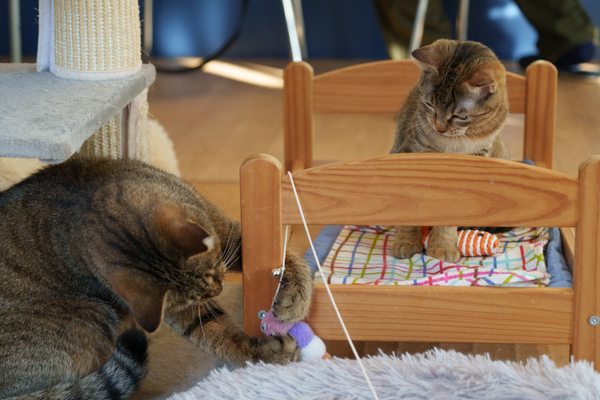 そうしたら人にはまだ慣れてないけど、おもちゃには目がない子猫がやってきた。では君とも遊んであげようってことで、おもちゃで相手をしたのだけど、ときどき「え、なんかこの人たちと遊んで大丈夫? ダマされてない?」って顔をするのがまたいい。