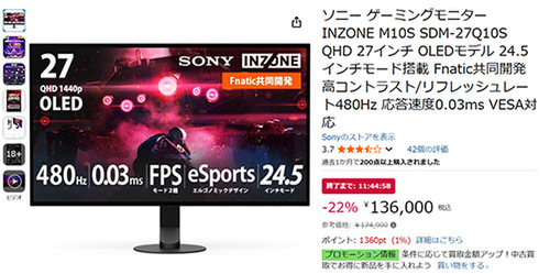 480Hzのリフレッシュレートと0.03msの応答速度を誇る有機ELモデルが、参考価格174,900円のところ、22%オフの136,000円という大幅割引価格で手に入ります。