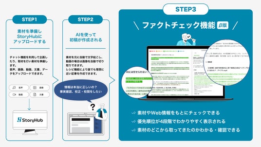 オールインワン編集アシスタント「StoryHub(ストーリーハブ)」(以下、StoryHub)を提供するStoryHub株式会社(本社:東京都千代田区、代表取締役CEO:田島 将太、以下、当社)は、2025年12月1日に「ファクトチェック」機能(β版)をリリースいたしました。コンテンツ制作時の負担となっている校閲作業をサポートすることで、コンテンツ制作・流通の課題解決を目指します。