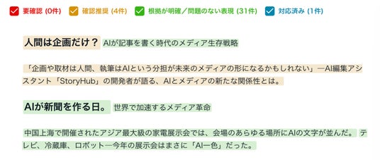 AIが記事を確認し、「確認が必要」「確認を推奨」「確認が不要」をわかりやすく分類。チェックが完了した文章は「対応済み」にステータス更新もできるため、どこまで確認が完了したかが一目でわかります。