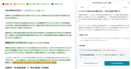 こうした背景を踏まえ、校正作業をサポートする既存の「レビュー」機能に加え、記事作成の情報源となったファイルや、Web情報をもとに事実確認をサポートする「ファクトチェック」機能(β版)を新たにリリース。本機能を提供することで、コンテンツ制作時にかかる校閲作業の負担軽減を目指します。
