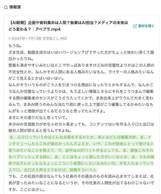 記事の1文に対して、アップロードしたファイルのどの部分から取得した情報なのかをわかりやすく表示。取材音源の時間や、膨大なPDFデータのページ番号などが表示されるため、確認の負担軽減が期待できます。また、引用元のファイルやWebサイトをすぐに開いて原文を確認することが可能です。