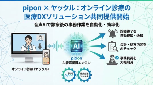 株式会社pipon(本社:東京都豊島区、代表取締役:北爪聖也)は、生活習慣病に特化したオンライン診療プラットフォームを展開する株式会社ヤックル(本社:東京都港区/代表取締役 社長:布川佳央)とパートナーシップを締結し、オンライン診療における 医療DXソリューション を共同で提供開始することをお知らせします。