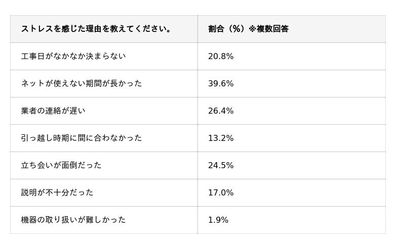 ただし、開通に対してストレスを感じたと答えた人の主な理由は、開通までの期間や業者の連絡が「遅い」というものです。