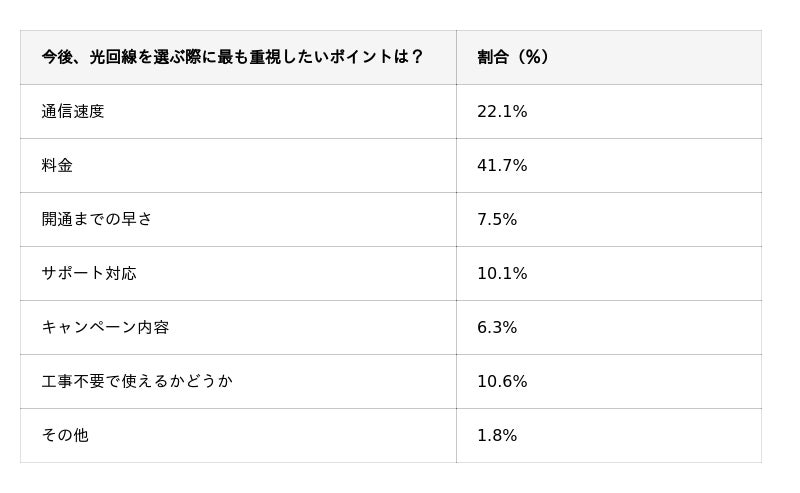 また、「工事不要で使えるかどうか」を重視する人は10.6%おり、光回線の開通工事の有無自体を気にする人が多いと分かります。