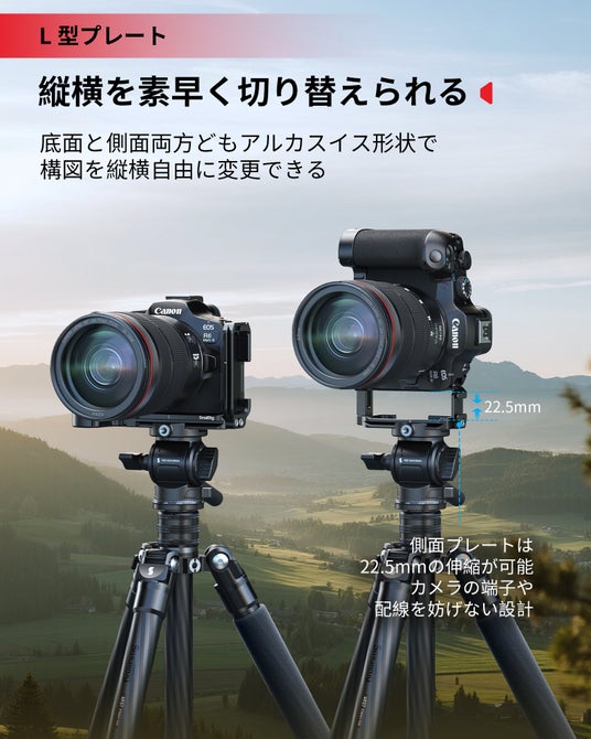 また、「L型プレート」は迅速な横縦切替えと安心設計で、底板・側板のアーカクイックリリースプレートによる三脚使用時の横位置・縦位置撮影を瞬時に切替えられます。そして、AirTag対応による紛失防止、22.5mmスライド調節可能な強力側板、3点ロックシステムによる徹底的な安定性を兼ね備えています。