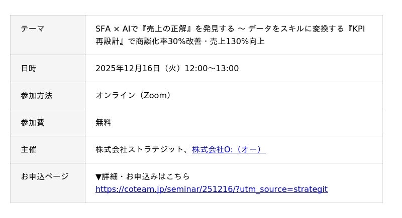 株式会社ストラテジット(本社:東京都港区、代表取締役社長:加藤 史恵、以下当社)は、株式会社O:(オー)(所在地:東京都中野区、代表:谷本 潤哉、以下「オー」)と共催で、2025年12月16日(火)12:00~13:00に、営業成果向上をテーマとした無料オンラインウェビナーを開催いたします。