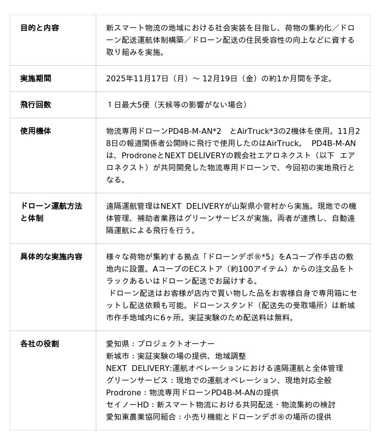 愛知県(知事:大村 秀章)と、新城市(市長:下江 洋行)、株式会社NEXT DELIVERY(本社:山梨県小菅村、代表取締役:田路 圭輔、以下NEXT DELIVERY)、株式会社グリーンサービス(本社:名古屋市北区、代表取締役社長:松井 清吾、以下 グリーンサービス)、株式会社Prodrone(本社:名古屋市天白区、代表取締役社長:戸谷 俊介、以下 Prodrone)、セイノーホールディングス株式会社(本社:岐阜県大垣市、代表取締役社長:田口 義隆、以下 セイノーHD)、愛知東農業協同組合(本社:愛知県新城市、代表理事組合長:海野 文貴、以下 JA愛知東)は、愛知県新城市にて、物流ドローンを活用した「新スマート物流」*1の長期事業化に向けた調査を行う実証実験を開始し、2025年11月28日(金)に、その様子を報道関係者に公開しました。